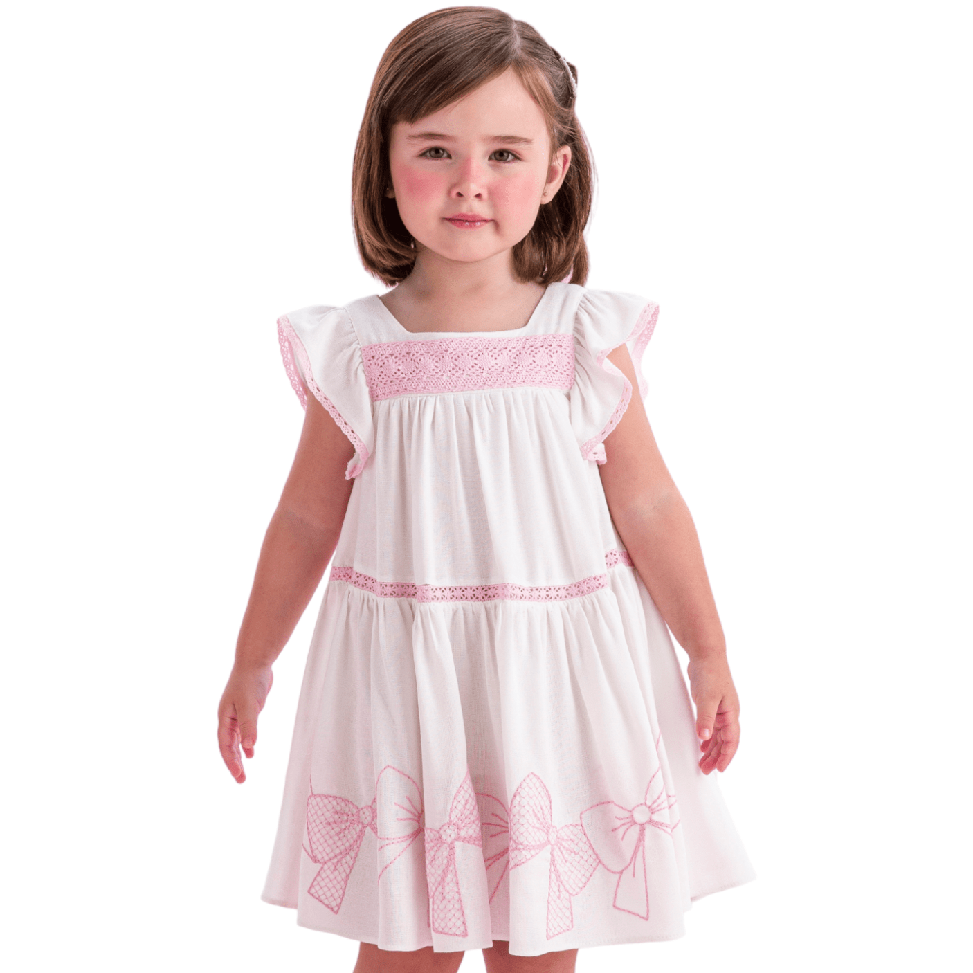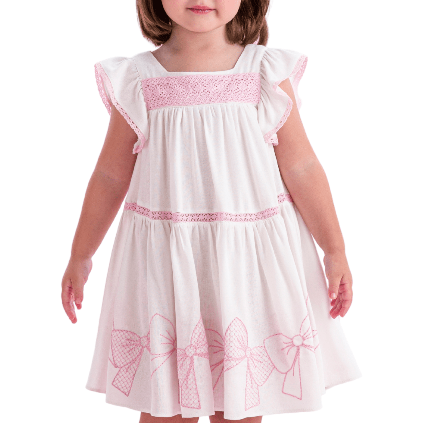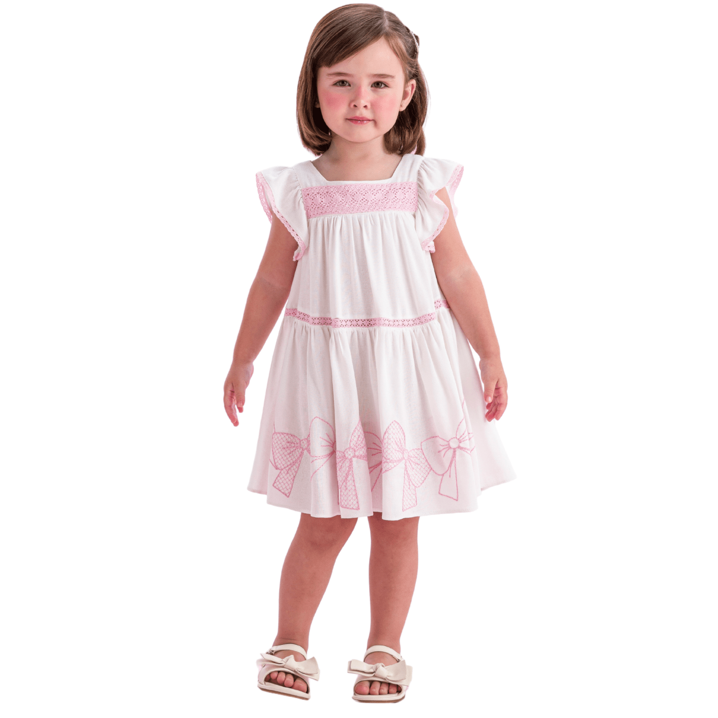 Confeccionado em tecido leve e macio, o vestido apresenta modelagem soltinha com babadinhos nas mangas e barrado fluido, ideal para acompanhar o movimento das pequenas. O destaque fica por conta dos bordados de laços na barra e das rendinhas cor-de-rosa que adornam o busto e a cintura, criando um visual romântico e atemporal.