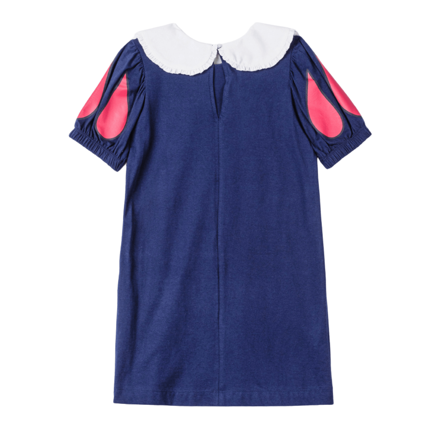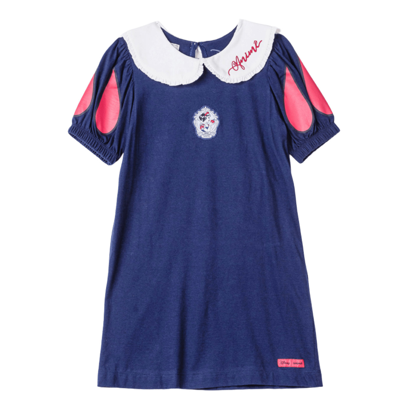 No centro do vestido, um aplique exclusivo da Branca de Neve enriquece a peça com um ar lúdico e emocional, reforçando a conexão com o universo mágico da Disney. O contraste do azul profundo com os detalhes em vermelho vibrante acrescenta personalidade à composição, equilibrando suavidade com vivacidade — uma combinação perfeita para princesas modernas.