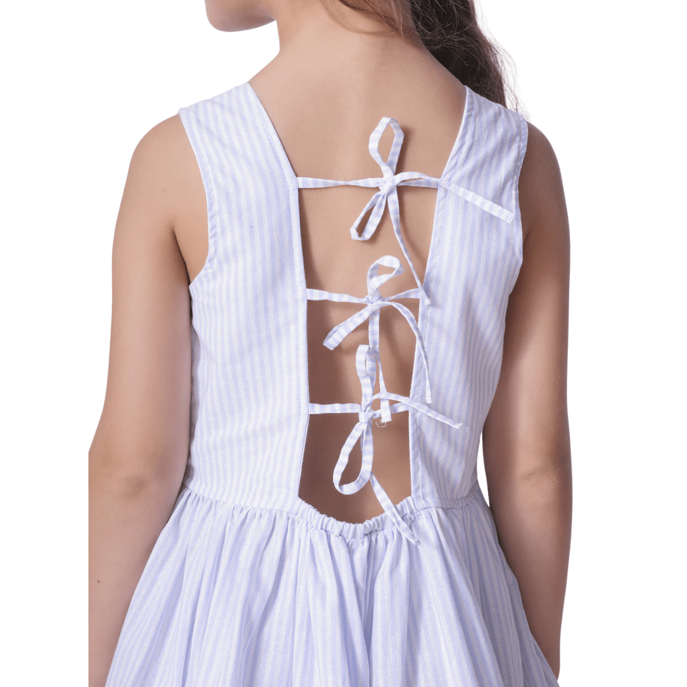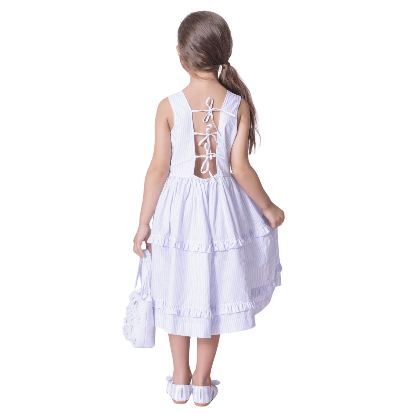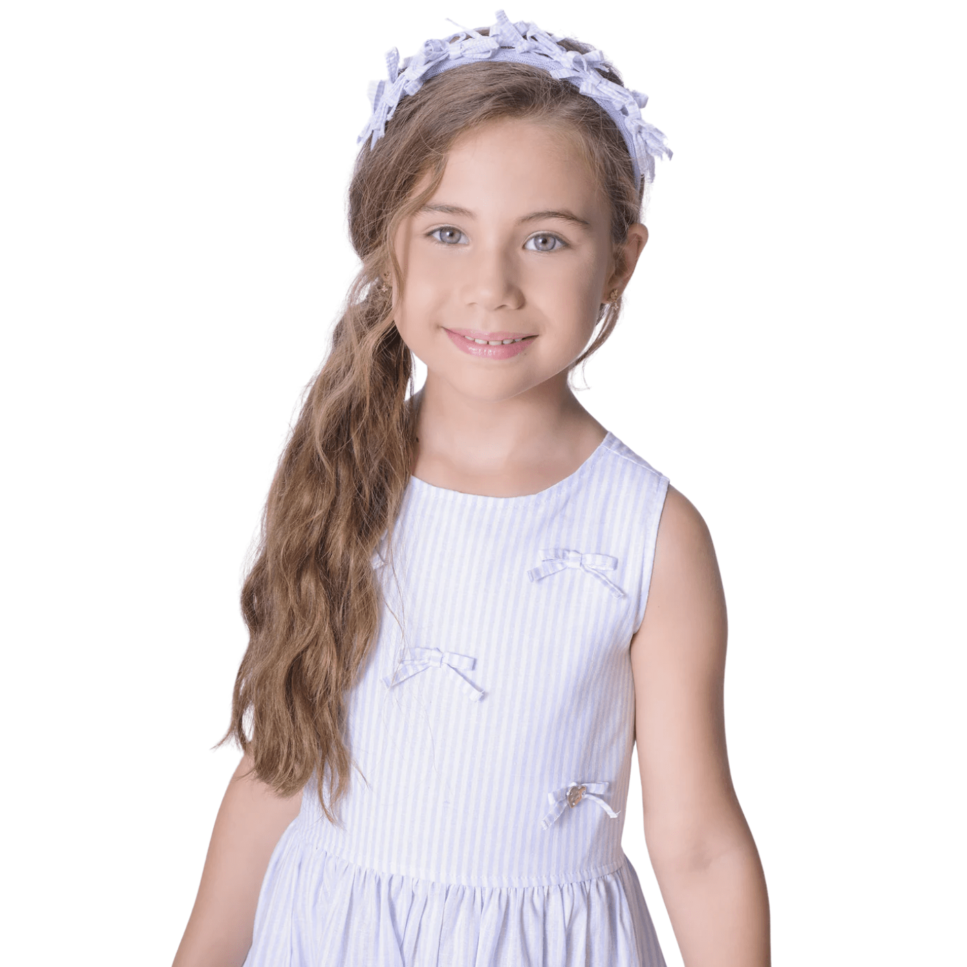 O design clássico com listras finas em azul claro e branco traz um ar elegante e atemporal, ideal para diversas ocasiões — desde passeios até eventos especiais. Os babados sutis na saia e os laços delicados aplicados na parte superior dão um toque romântico e encantador ao visual, reforçando toda a delicadeza da marca Pituchinhus.