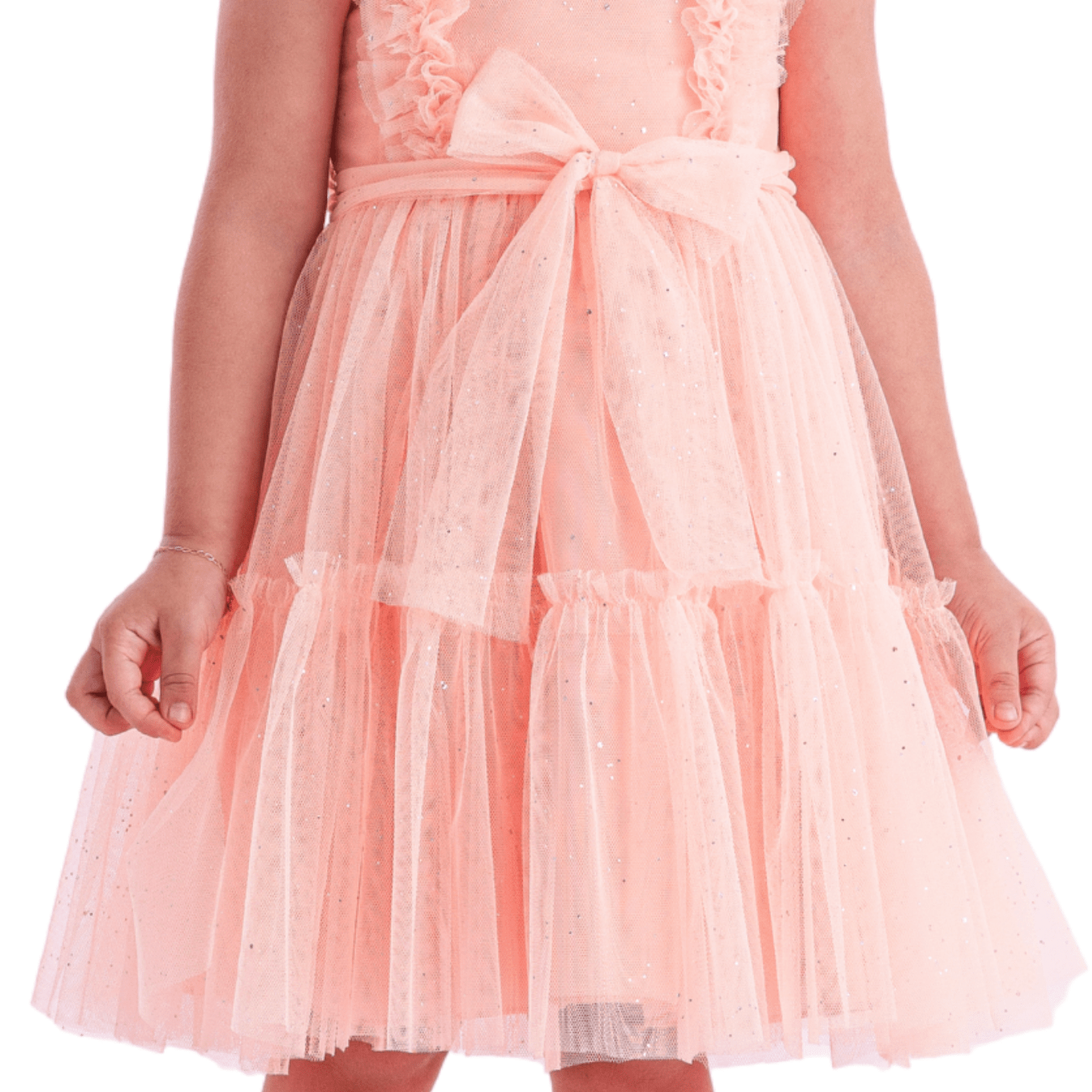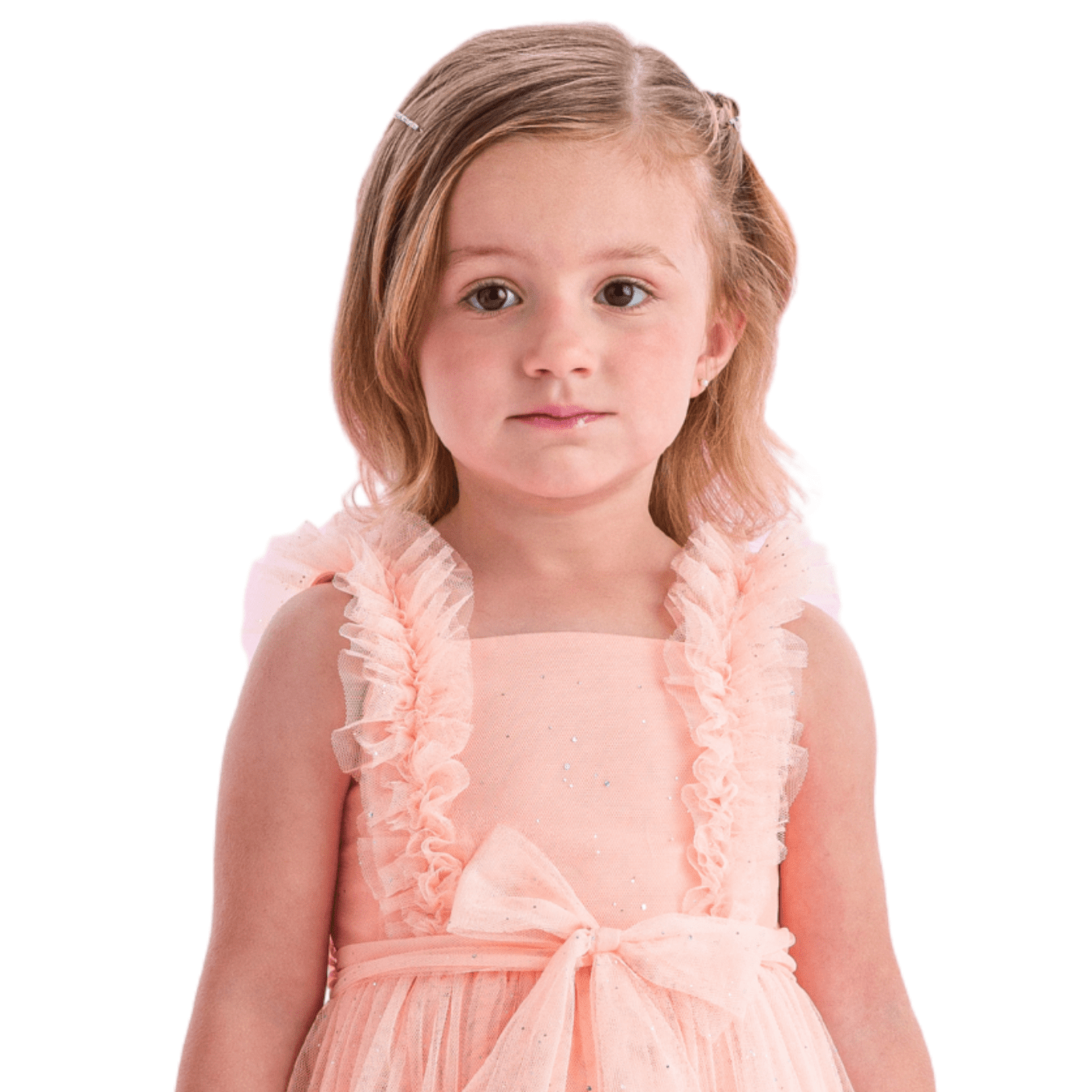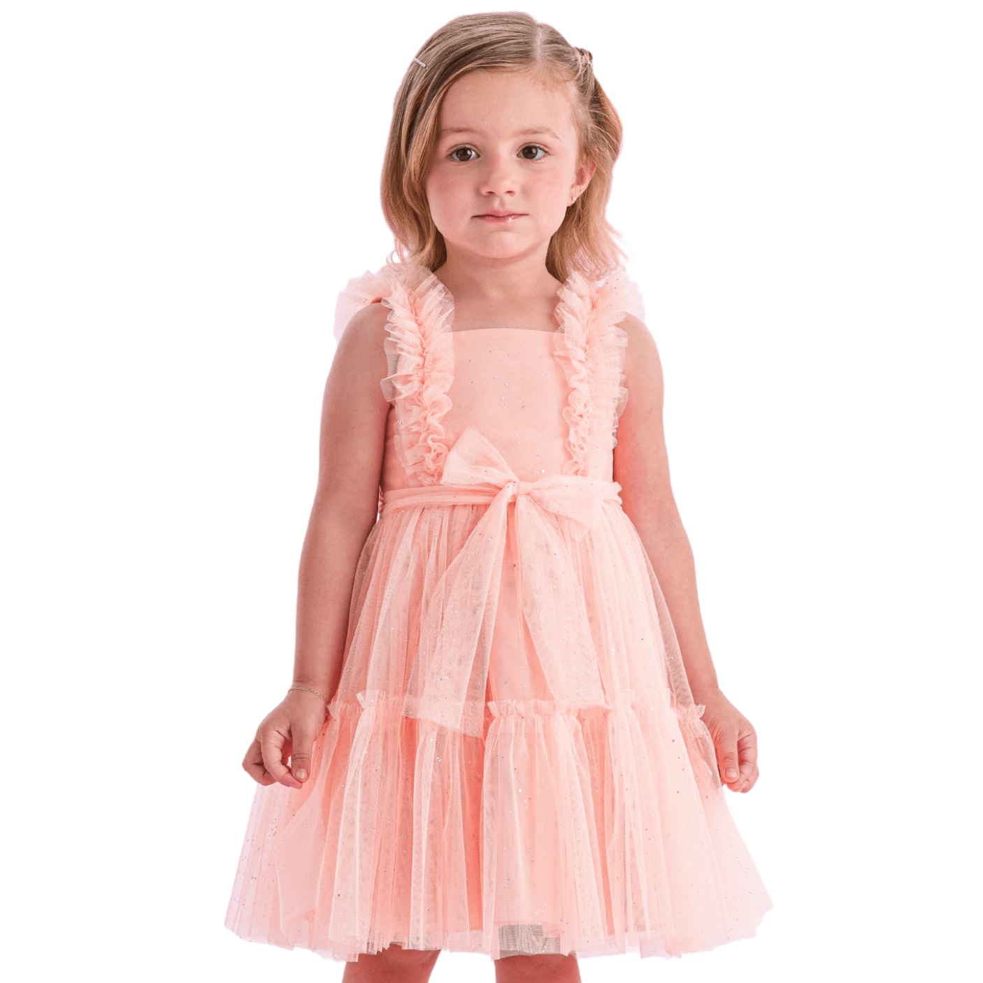 O Vestido Tule Glitter Laranja Laço Petit Cherie é a escolha perfeita para transformar qualquer ocasião em um momento mágico. Confeccionado em camadas delicadas de tule com acabamento em glitter, ele traz brilho suave e um visual encantador, que faz as pequenas brilharem com muito charme e elegância.